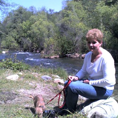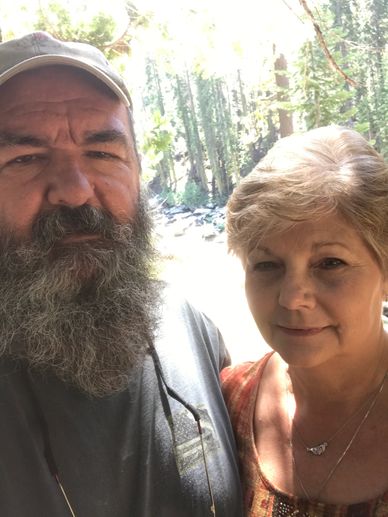 Deb and Harley creek-side in Sequoia campgrround